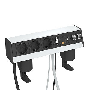 Настольный бокс с соединительным кабелем, кабельный вывод с нижней стороны, с 2 крепежными зажимами для фиксации на столешнице толщиной от 8 до 40 мм. Комплектация: - с 3 розетками 0° с защитным контактом, черного цвета, с сетевым кабелем 3,0 м с угловым штекером CEE 7/7. - с разъемом VGA 15-полюсным, HDD, с сетевым кабелем 3,0 м со штекером. - с аудиоразъемом 3,5 мм, с сетевым кабелем 3,0 м со штекером. - с разъемом USB 2.0 A, с сетевым кабелем 3,0 м со штекером А, с 2 телекоммуникационными модулями RJ45 на RJ45, соединение 1:1, КАТ 6 экранированные.