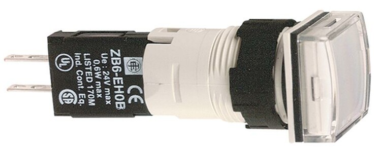сигнальная лампа 16мм 12-24В белая квадратная. серия продукта: Harmony XB6 - тип устройства или его аксессуаров: сигнальная лампа в сборе - краткое название устройства: XB6 - монтажный диаметр: 16 мм. Преимущества: Элементы конструкции визуально различимы с большого расстояния благодаря яркому цвету и маркировке, поэтому ошибки при первоначальном подключении и последующих операциях обслуживания сводятся к минимуму. Корпус со степенью защиты IP66 защищает данное устройство от ударных нагрузок, а также от пыли, воды и вибрации, поэтому оно идеально подходит для работы в неблагоприятных условиях окружающей среды.Применения: в средах, где необходима хорошая устойчивость к химическим веществам и/или двойная электрическая изоляция.