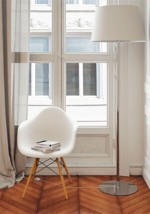 Торшер и настольная лампа, создающие мягкий рассеянный свет. Основание изготовлено из хромированного металла, абажур ткань на полимерной основе.