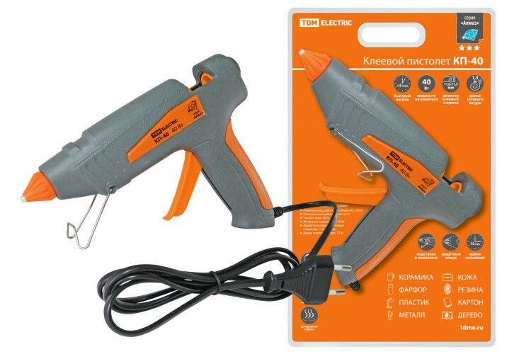 Применение:В быту: мелкий ремонт, рукоделие и т.д.В промышленности: закрепление проводов, фиксация деталей и т.д.В строительстве: заделка швов, крепление декоративных элементов и т.д. Материалы:Нагревательный элемент выполнен из меди, алюминия и стали.АБС - пластикПреимущества:Быстрый разогревУдобная эргономичная рукоятка для комфортной длительной работыОптимальный состав клея для применения с широким спектром материалов.Высокая производительность по выходу клеяУдобный курок позволяет легко контролировать количество наносимого клея.Удобная подставка для защиты от повреждения поверхности нагревательным элементом. Назначение:Для быстрого и безопасного соединения различных материалов, повышения вибростойкости и устойчивости от окисления электрических соединений. 0: