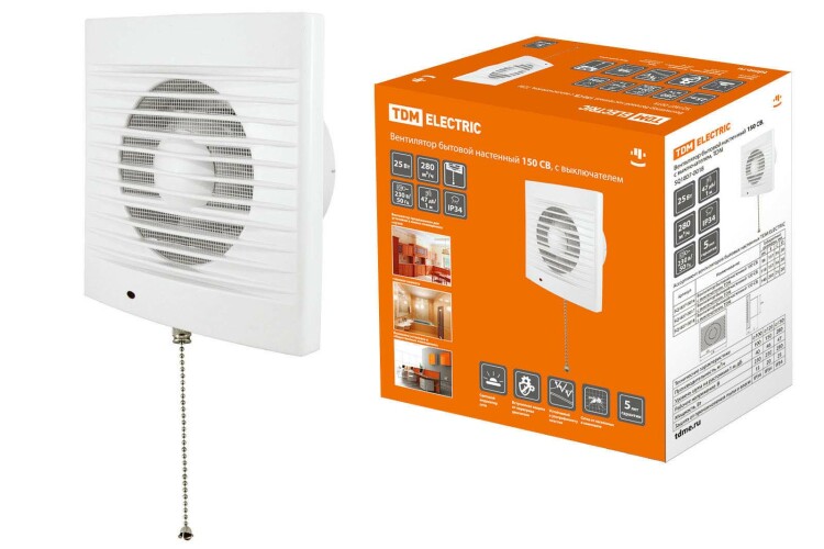 Вентилятор бытовой настенный 150 СВ, с выключателем, TDM (кр.1шт)