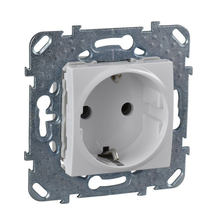 Розетка Schneider Electric UNICA (белый) с заземлением, без шторок предназначена для сетей до 250 В на ток до 16 А.