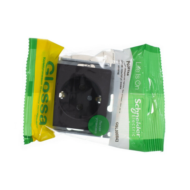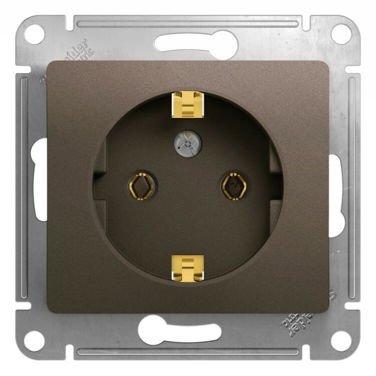 Механизм Systeme Electric (ранее Schneider Electric) серии Glossa (цвет шоколад) розетки одинарной с заземлением и без шторок подходит для сетей 250 В, на ток 16 А. Заземляющий контакт обеспечивает дополнительную защиту от удара электрическим током. При наличии заземления электрический потенциал уходит в землю, защищая человека. Выполнен из материала PС+ASA, стойкого к УФ-излучению и появлению царапин. Эргономичные клеммы розеток расположены в один ряд.