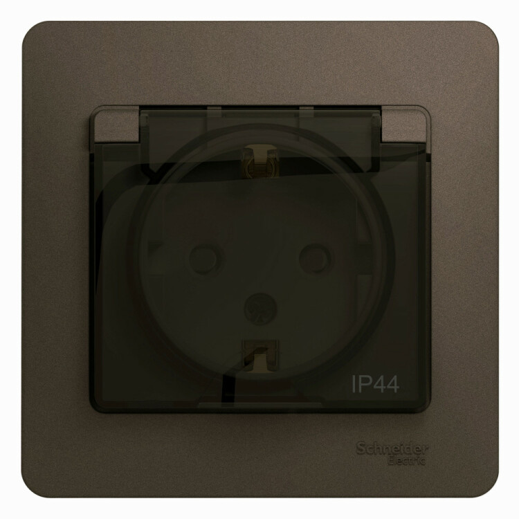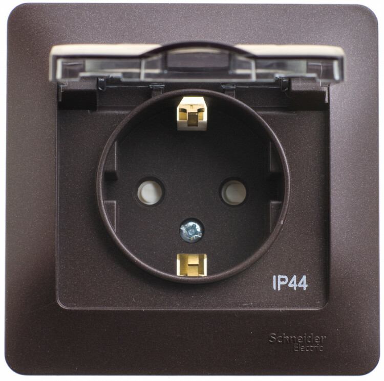 Розетка Systeme Electric (ранее Schneider Electric) серии Glossa (в сборе, цвет шоколад) одинарная с заземлением, шторками и крышкой подходит для сетей 250 В, на ток 16 А.