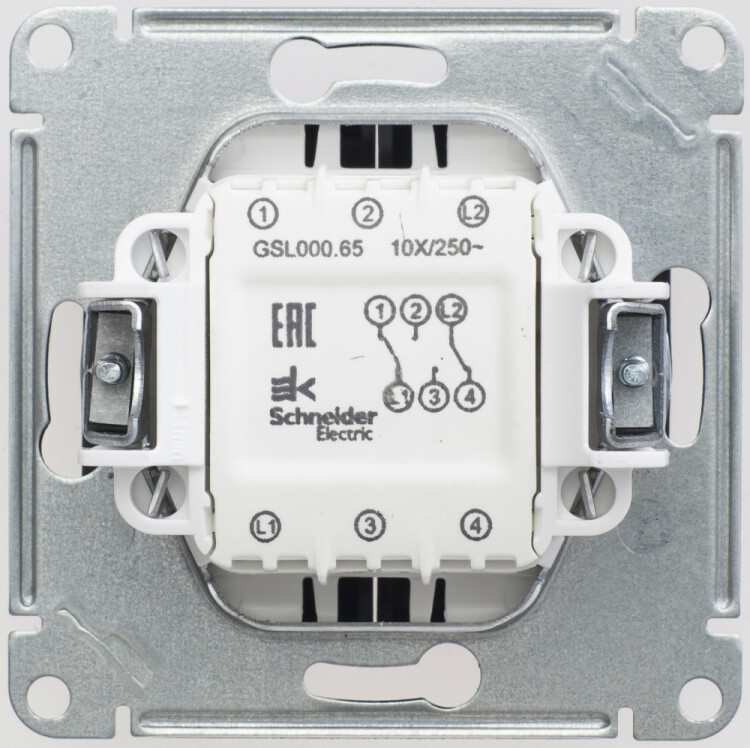 Механизм Systeme Electric (ранее Schneider Electric) серии Glossa (цвет шоколад) переключателя 2-клавишного подходит для сетей 250 В, на ток 10 А. Переключатель позволяет управлять одним источником света с двух точек. Выполнен из материала PС+ASA, стойкого к УФ-излучению и появлению царапин. Эргономичные клеммы расположены в два ряда: сверху и снизу.