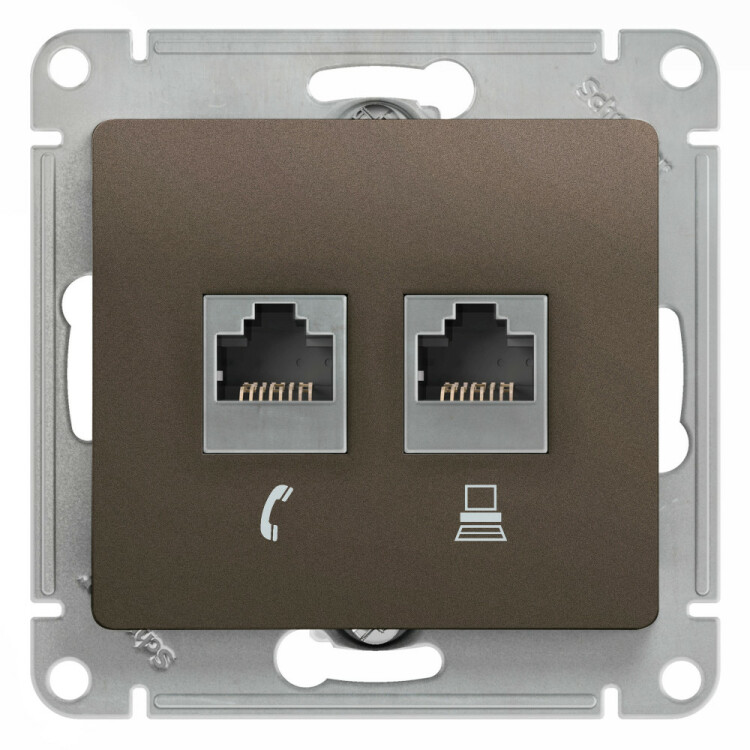 Механизм Systeme Electric (ранее Schneider Electric) серии Glossa (цвет шоколад) двойной розетки разъёмами RJ45 категория 5е и RJ11 предназначен для удобного и быстрого подключения вашего компьютера и телефона к соответствующим сетям.