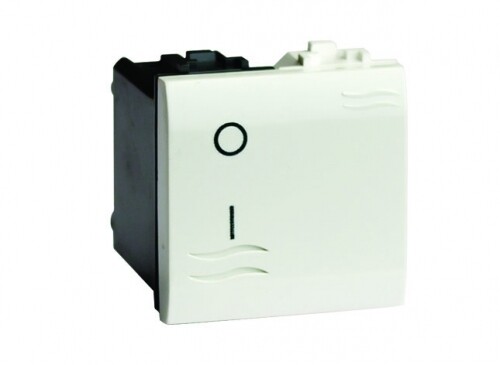 Выключатель двухполюсный с подсветкой. Назначение: включение/выключение освещения. Характеристики: номинальный ток − 16 А; номинальное напряжение − 250 B. Кол-во модулей: 2. Цвет: белый