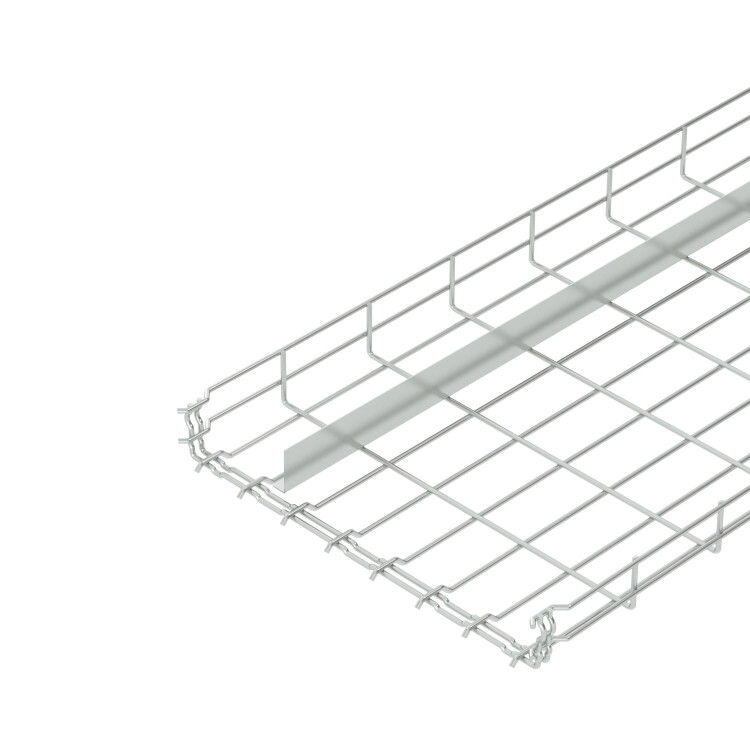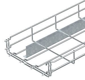 Проволочный лоток с соединителем соответствующей формы и приваренной разделительной полочкой, с высотой боковой стенки 55 мм.