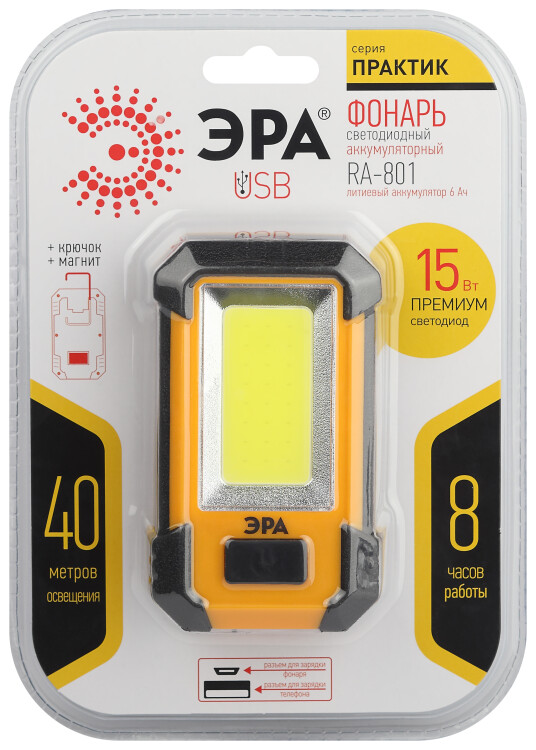 ЭРА RA-801 мощный фонарь-powerbank с литиевым аккумулятором. Яркий свет + возможность оперативно подзарядить любое мобильное устройство. Два функциональных гаджета в одном. Незаменимая вещь в путешествии, за городом, на строительных и ремонтных работах. Мощный литиевый аккумулятор 6 000 мАч - гарантия бесперебойной работы устройства в течение 8 полных часов. USB-шнур в комплекте.