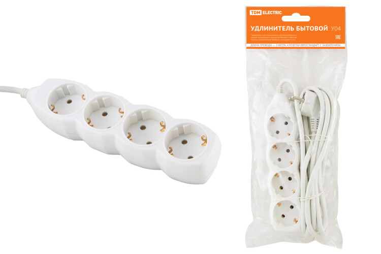 Удлинитель бытовой У04 4 гнезда, 3метра, с заземлением, ПВС 3х1мм2 16А/250В TDM (кр.1шт)