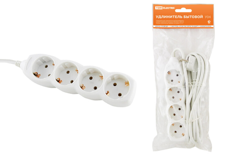 Удлинитель бытовой У04 4 гнезда, 5метров, с заземлением, ПВС 3х1мм2 16А/250В TDM (кр.1шт)