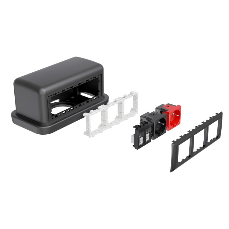 Напольная двухсторонняя башенка BUS. Назначение: организация рабочего места в открытом интерьере, под столами, трибунами и т. д. Подходят для монтажа ЭУИ с 2 сторон, по 6 модулей, монтажа ЭУИ серий «Avanti», ЭУИ «Вива» (Viva) и «45×45 мм» в соответствующих каркасах. Комплект поставки: основание − 1 шт., стойка − 1 шт., крышка − 1 шт., саморезы для монтажа стойки к основанию базы — 4 шт., внутренняя центральная перегородка − 1 шт., рамка на 6 модулей − 2 шт., заглушка сплошная на 6 модулей (накладка для декора неиспользуемого проёма башенки) − 1 шт. Дополнительно необходимо заказать: каркасы под ЭУИ в зависимости от серии (ЭУИ «Вива» (Viva) и «45×45 мм») или рамку-суппорт («Avanti»). Цвет — чёрный.