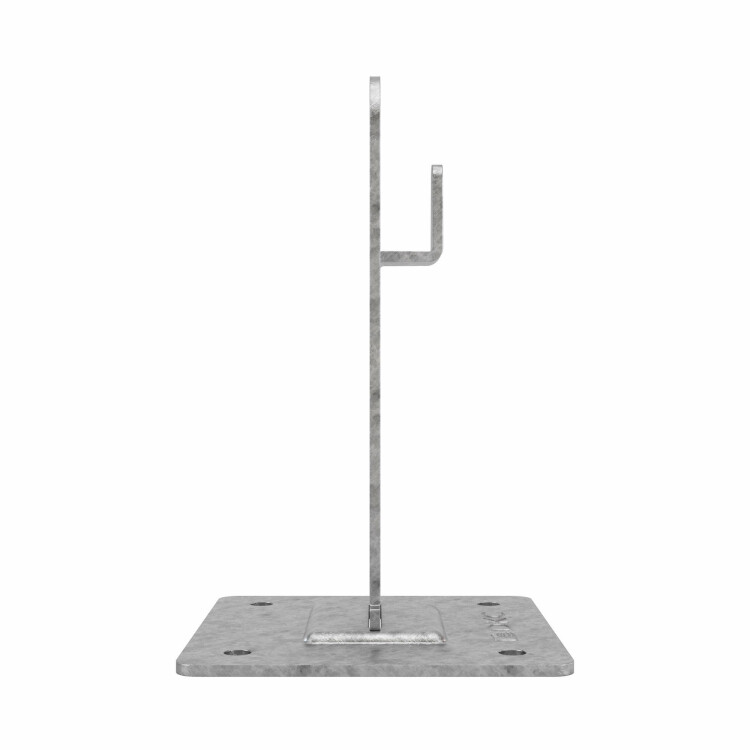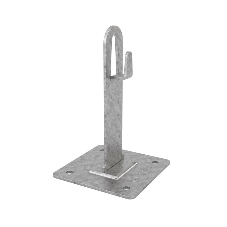 Металлический держатель используется для фиксации молниеприемной сетки на основе прутка диаметром 8-10 мм на плоской либо скатной кровле при помощи саморезов. Проводник крепится безвинтовым зажимом с применением плоскогубцев. Материал - горячеоцинкованная сталь, высота - 100 мм.