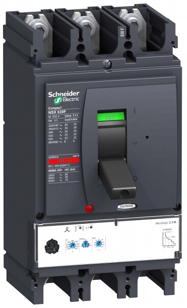 Автоматический выключатель Compact NSX630N Schneider Electric, 3P3d - номинальный ток 500 А - Icu = 50 кА 380/415 В - Ics=100% Icu - с электронным расцепителем Micrologic 2.3-M (защита электродвигателей LSOI) - ШхВхГ - 160x290x150 мм - исполнение - стационарный - монтаж - на DIN-рейке или плате. Преимущества: Прямой доступ к экономии затрат, безопасность и защита, контроль и измерение параметров электроэнергии, надежность энергоснабжения, простота и удобство. Применения: Применение в системах электроснабжения объектов любого масштаба – от крупнейших промышленных предприятий до офисных зданий для защиты распределительных сетей, генераторов, кабелей большой протяженности, электродвигателей.