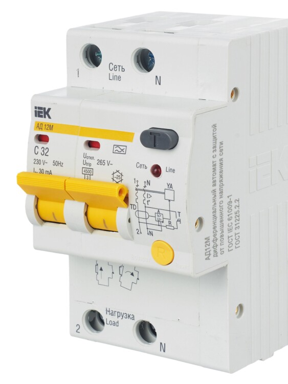 В изделиях предусмотрена индикация срабатывания от дифференциального тока, а для АД12М также светодиодная индикация включенного состояния. АД12М сохраняет работоспособность при снижении напряжения электрической сети до 110 В.