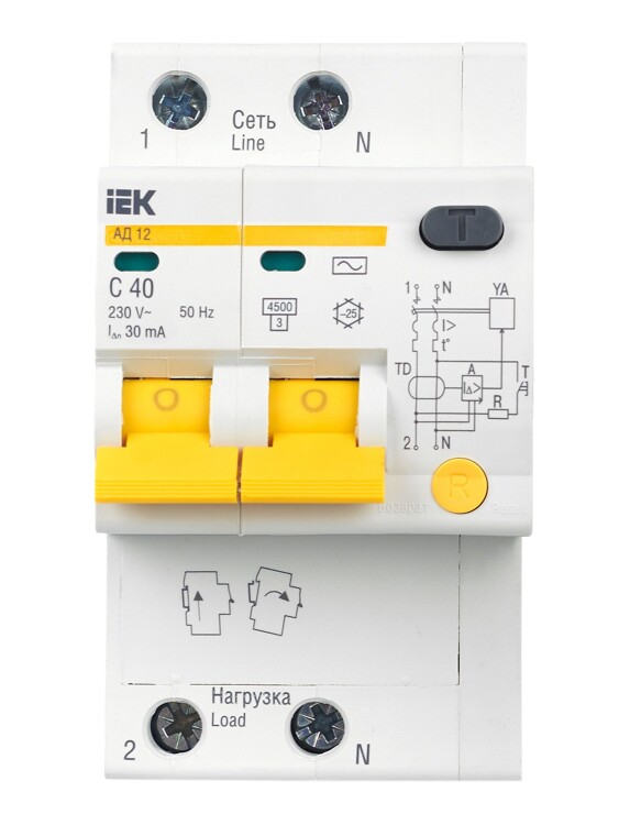 В изделиях предусмотрена индикация срабатывания от дифференциального тока, а для АД12М также светодиодная индикация включенного состояния. АД12М сохраняет работоспособность при снижении напряжения электрической сети до 110 В.
