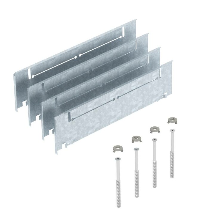 Комплект для увеличения высоты монтажных оснований UZD250-3 и UGD250-3 высотой 70-125 мм, комплект состоит из 4 металлических надставок, 4 нивелировочных винтов и 4 поворотных фиксаторов.