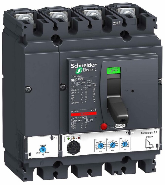 Автоматический выключатель Compact NSX250F Schneider Electric, исполнение – 4P 3d, 4d, 3d + N/2 - номинальный ток 250 А - Icu = 36 kA 380/415 В - Ics = 100% Icu - с электронным расцепителем Micrologic 2.2 (защита LSOI) - ШхВхГ – 140x161x86 мм - исполнение – стационарный - монтаж - на плате. Преимущества: Прямой доступ к экономии затрат, безопасность и защита, контроль и измерение параметров электроэнергии, надежность энергоснабжения, простота и удобство. Применения: Применение в системах электроснабжения объектов любого масштаба – от крупнейших промышленных предприятий до офисных зданий для защиты распределительных сетей, генераторов, кабелей большой протяженности, электродвигателей.