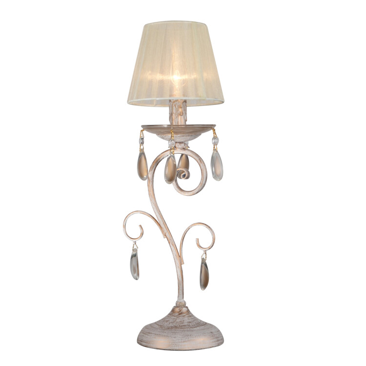 Светлый настольный светильник из металла Rivoli Oro (арт. 2011-501) имеет оригинальное покрытие корпуса, выполненное в технике золотая патина. Такое решение придает интерьеру роскоши и изысканности. Итальянские дизайнеры дополнительно декорировали эту настольную лампу стеклянными подвесками-каплями с хрустальными кристаллами.