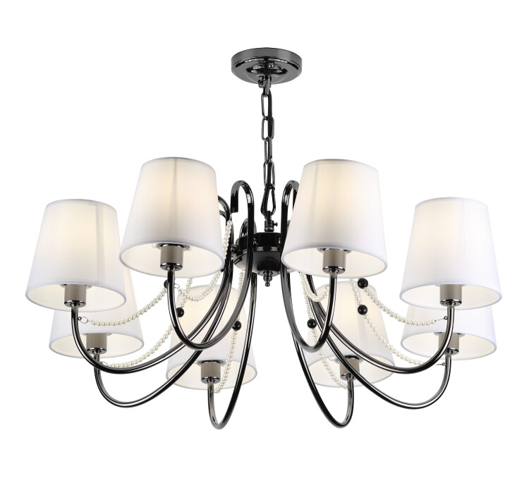 "Perla" в переводе с итальянского - "жемчужина". Жемчуг - настоящий подарок моря, который вот уже сотни лет манит человечество своей красотой и уникальностью. Зная толк в настоящих драгоценностях, итальянские дизайнеры украсили люстры и бра коллекции Rivoli Perla филигранными жемчужными бусинами. Для декора выбран белый оттенок жемчуга, а вот для покрытия металлического каркаса - цвет "тёмный жемчуг". Так удалось подчеркнуть всю природную красоту этого материала и представить светотехнику как ювелирное изделие. В коллекции представлена 8-ми рожковая люстра.