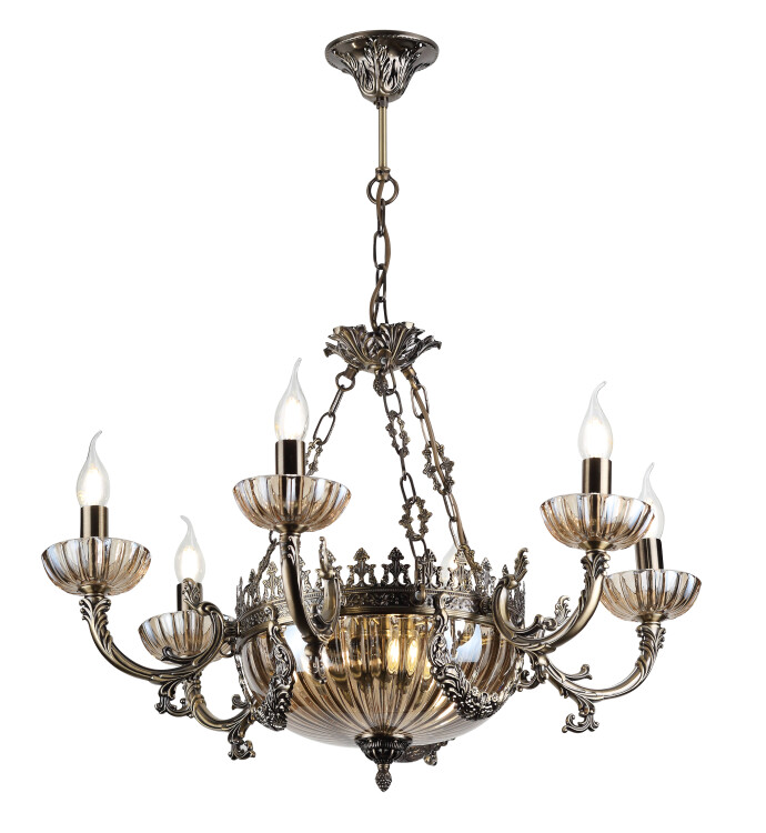 Декоративная стеклянная чаша в центре корпуса может подсвечиваться 3 небольшими лампочками. В рожках этой люстры лучше всего смотрятся лампы с колбой свеча. Источники света Е14 60 Вт.