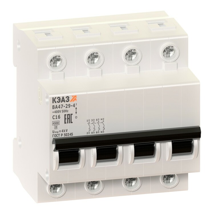 Модульный автоматический 4 полюсный выключатель переменного тока с предельной коммутационной способностью при переменном токе 4.5 кА на номинальный ток 1 А .