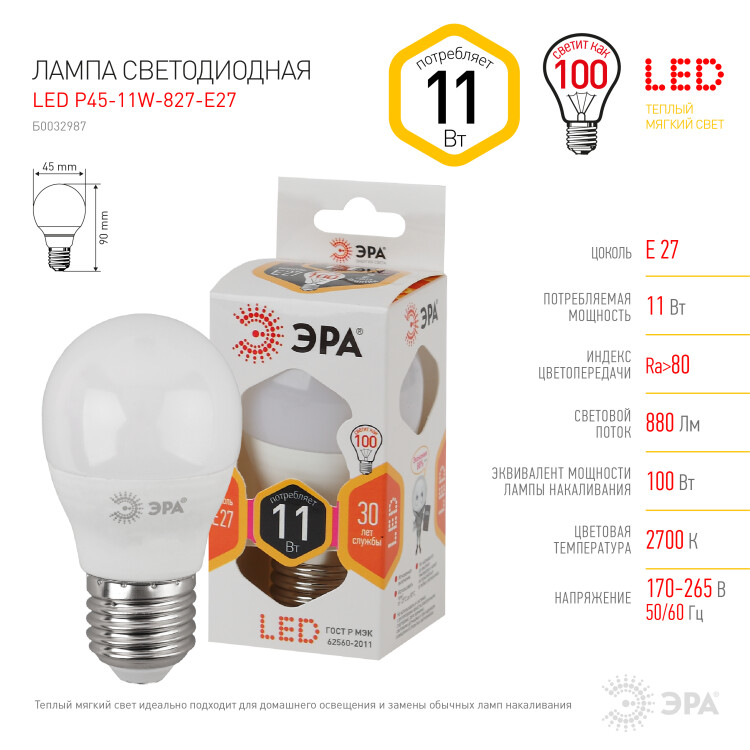 Лампочка светодиодная ЭРА STD LED P45-11W-827-E27 E27 / Е27 11Вт шар теплый белый свет (кр. 1шт)