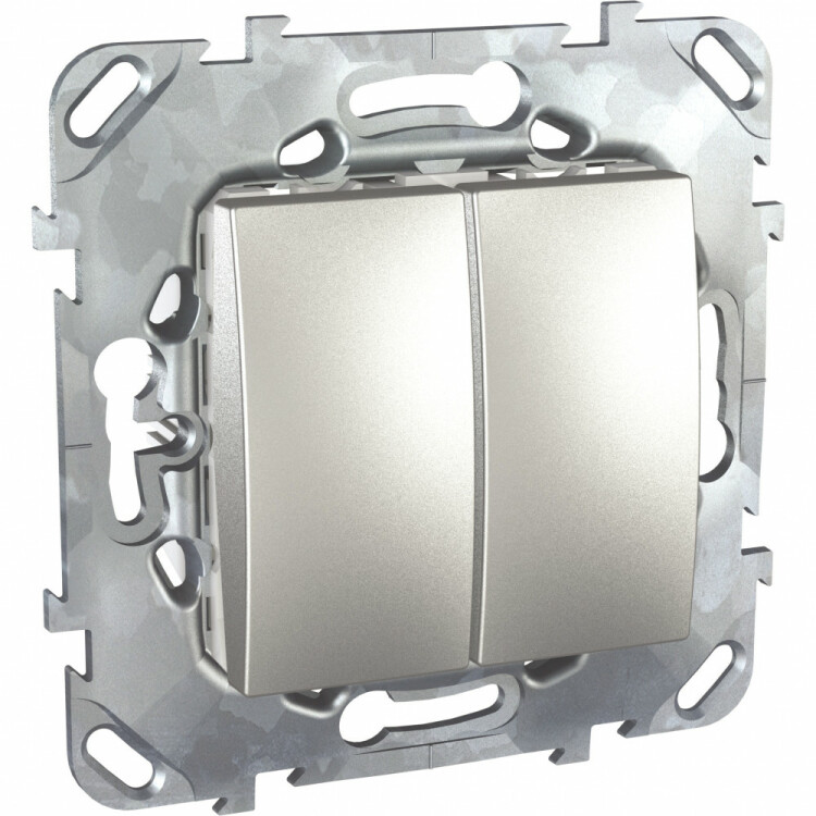 Выключатель двухклавишный Schneider Electric UNICA ТОР (алюминий) без подсветки предназначен для сетей до 250 В на ток до 10 А.
