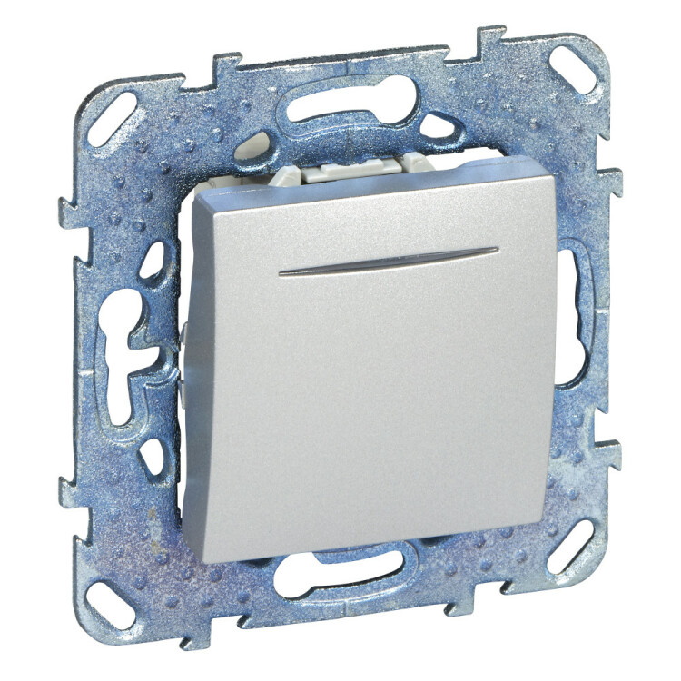 Переключатель одноклавишный Schneider Electric UNICA ТОР (алюминий) с подсветкой предназначен для сетей до 250 В на ток до 10 А.