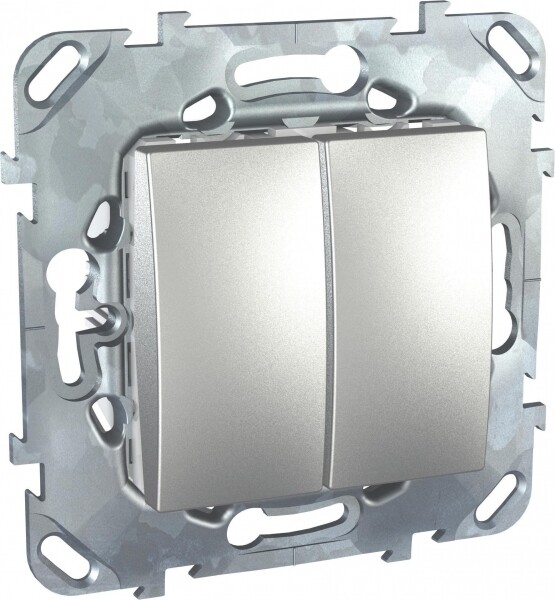 Переключатель двухклавишный Schneider Electric UNICA ТОР (алюминий) без подсветки предназначен для сетей до 250 В на ток до 10 А.