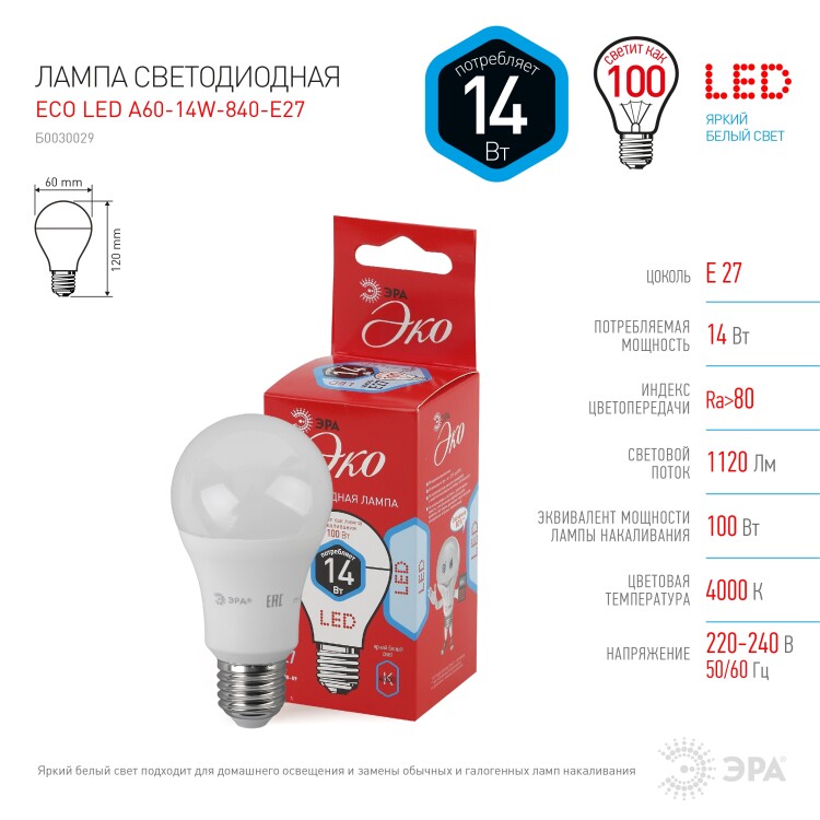 Эта светодиодная лампа ЭРА Серии Бюджет - современный, качественный и доступный источник света. Позволяет экономить до 90% электроэнергии по сравнению с лампой накаливания с аналогичным световым потоком. Светит ярким белым светом, который максимально приближен к естественному дневному. Идеальна для ежедневного применения в быту. Мгновенное включение. Ровное освещение. Можно использовать как с люстрами, так и со светильниками, в том числе настольными и бра.