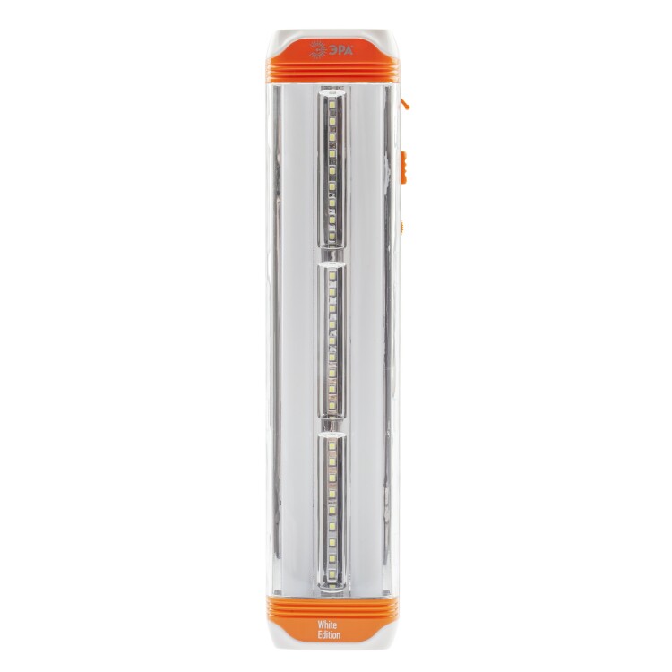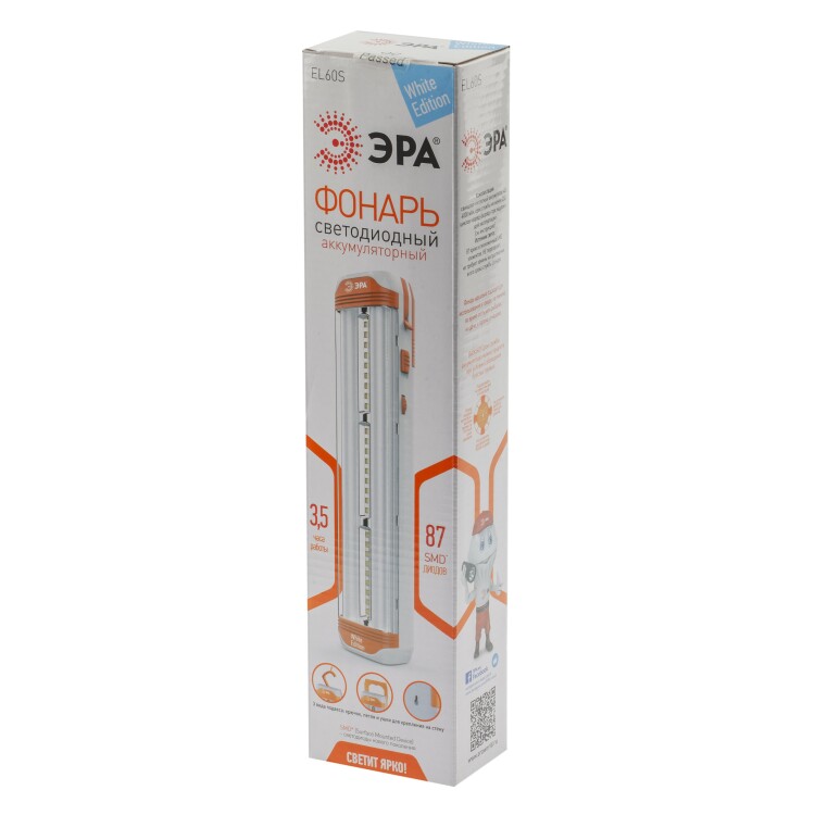 Туристический аккумуляторный фонарь EL60S на светодиодах нового поколения (SMD). В фонаре встроены 3 пластины по 9 диодов в каждой, а по бокам 2 колбы, а в каждой колбе ещё по 30 диодов. Всего получаем 87 сверх ярких диодов, которые не перегорают и не требуют замены. Такие диоды светят ярче обычных на 50% и более качественным, белым светом по цветовой температуре приближенным к естественному. То есть 87 диодов - это очень яркий и мощный свет. Очевидно, что при полной мощности фонарь светит очень ярко и поэтому предусмотрены функции регулировки освещения, например, можно включить только светодиодные пластины. Фонарь питается от аккумулятора 4В 4Ач, который заряжается от сети в 220 В. В автономном режиме фонаря хватает на 3,5 часа непрерывной работы. Дальность луча составляет 17 метров, мощность 5В, а световой поток - 320 Лм.Также в фонаре предусмотрено три вида подвеса: крючок, петля и ушки для крепления на стену. Функциональный дизайн фонаря делает удобным его использования в экстренных ситуациях, когда необходим мощный источник света. Его можно использовать как на природе, во время рыбалки или походов, так и в быту, например, на даче или в гараже. Различные системы подвесов помогают освободить руки, а регулятор освещения настроить необходимую яркость освещения.