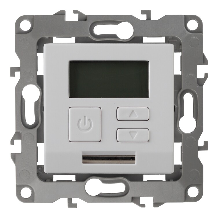 Терморегулятор теплый пол / отопление электронный серии Эра 12 СУ механизм цвет белый 12-4111-01. Номинальные характеристики 16А 230В. Сделана из поликарбоната. Монтаж в подрозетник производится и на лапки, и на винты. Рамки приобретаются отдельно. Рамки Эра 12: 1 пост 12-5001-хх, 2 поста 12-5002-хх, 3 поста 12-5003-хх, 4 поста 12-5004-хх, 5 постов 12-5005-хх. Рамки Эра 12 Сатин: 1 пост 12-5101-хх, 2 поста 12-5102-хх, 3 поста 12-5103-хх, 4 поста 12-5104-хх, 5 постов - 12-5105-хх (хх - код цвета: 01-белый, 02-слоновая кость, 03-алюминий, 04-шампань, 05-антрацит, 06-чёрный, 07-ольха(белёный дуб-сатин), 08-вишня, 09-дуб, 10-венге, 11-сосна, 21-жёлтый, 22-оранжевый, 23-красный, 24-охра, 25-бордо, 26-лайм, 27-зелёный, 28-голубой, 29-синий).
