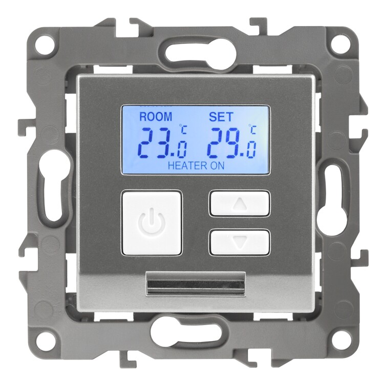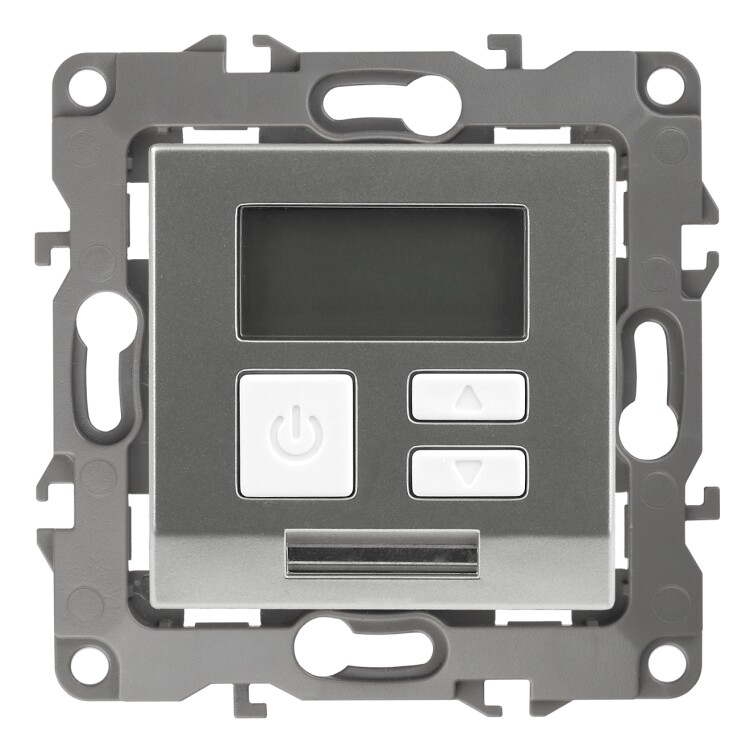 Терморегулятор теплый пол / отопление электронный серии Эра 12 СУ механизм цвет алюминий 12-4111-03. Номинальные характеристики 16А 230В. Сделана из поликарбоната. Монтаж в подрозетник производится и на лапки, и на винты. Рамки приобретаются отдельно. Рамки Эра 12: 1 пост 12-5001-хх, 2 поста 12-5002-хх, 3 поста 12-5003-хх, 4 поста 12-5004-хх, 5 постов 12-5005-хх. Рамки Эра 12 Сатин: 1 пост 12-5101-хх, 2 поста 12-5102-хх, 3 поста 12-5103-хх, 4 поста 12-5104-хх, 5 постов - 12-5105-хх (хх - код цвета: 01-белый, 02-слоновая кость, 03-алюминий, 04-шампань, 05-антрацит, 06-чёрный, 07-ольха(белёный дуб-сатин), 08-вишня, 09-дуб, 10-венге, 11-сосна, 21-жёлтый, 22-оранжевый, 23-красный, 24-охра, 25-бордо, 26-лайм, 27-зелёный, 28-голубой, 29-синий).