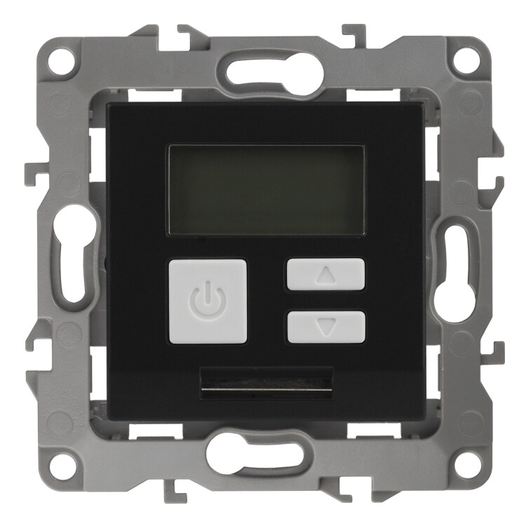 Терморегулятор теплый пол / отопление электронный серии Эра 12 СУ механизм цвет антрацит 12-4111-05. Номинальные характеристики 16А 230В. Сделана из поликарбоната. Монтаж в подрозетник производится и на лапки, и на винты. Рамки приобретаются отдельно. Рамки Эра 12: 1 пост 12-5001-хх, 2 поста 12-5002-хх, 3 поста 12-5003-хх, 4 поста 12-5004-хх, 5 постов 12-5005-хх. Рамки Эра 12 Сатин: 1 пост 12-5101-хх, 2 поста 12-5102-хх, 3 поста 12-5103-хх, 4 поста 12-5104-хх, 5 постов - 12-5105-хх (хх - код цвета: 01-белый, 02-слоновая кость, 03-алюминий, 04-шампань, 05-антрацит, 06-чёрный, 07-ольха(белёный дуб-сатин), 08-вишня, 09-дуб, 10-венге, 11-сосна, 21-жёлтый, 22-оранжевый, 23-красный, 24-охра, 25-бордо, 26-лайм, 27-зелёный, 28-голубой, 29-синий).