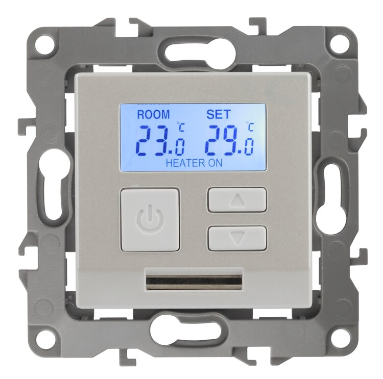 Терморегулятор теплый пол / отопление электронный серии Эра 12 СУ механизм цвет перламутр 12-4111-15. Номинальные характеристики 16А 230В. Сделана из поликарбоната. Монтаж в подрозетник производится и на лапки, и на винты. Рамки приобретаются отдельно. Рамки Эра 12: 1 пост 12-5001-хх, 2 поста 12-5002-хх, 3 поста 12-5003-хх, 4 поста 12-5004-хх, 5 постов 12-5005-хх. Рамки Эра 12 Сатин: 1 пост 12-5101-хх, 2 поста 12-5102-хх, 3 поста 12-5103-хх, 4 поста 12-5104-хх, 5 постов - 12-5105-хх (хх - код цвета: 01-белый, 02-слоновая кость, 03-алюминий, 04-шампань, 05-антрацит, 06-чёрный, 07-ольха(белёный дуб-сатин), 08-вишня, 09-дуб, 10-венге, 11-сосна, 21-жёлтый, 22-оранжевый, 23-красный, 24-охра, 25-бордо, 26-лайм, 27-зелёный, 28-голубой, 29-синий).