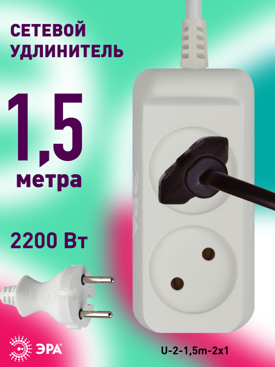 Компактный удлинитель ЭРА U-2-1,5m-2x1 на 2 розетки, без заземления, с проводом 1,5 метра. Можно использовать для мощных электроприборов. Максимальная нагрузка - 10 А / 2200 Вт. Изготовлен из надёжного полипропилена со специальными антипиренами, препятствующими горению. Прочный и гибкий двухжильный провод ПВС 2x1мм2. Удобная вилка и аккуратный внешний вид с закруглёнными углами. Эксплуатируется при температурах в помещении от -25 до +40 С.