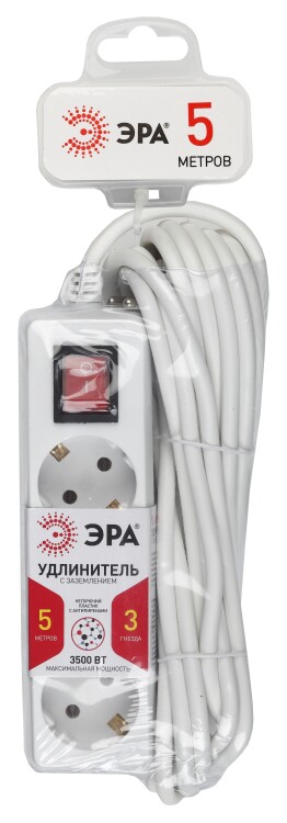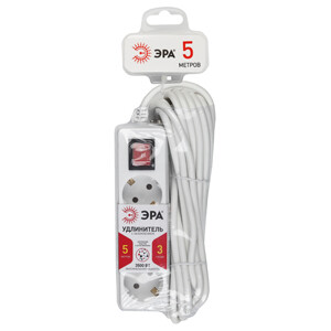 Удлинитель ЭРА серии U с заземлением: провод 3x1мм2, 100% медь, корпус - полипропилен с антипиренами (негорючий), контактные группы - латунь, максимальная нагрузка - 16A/3500Вт.