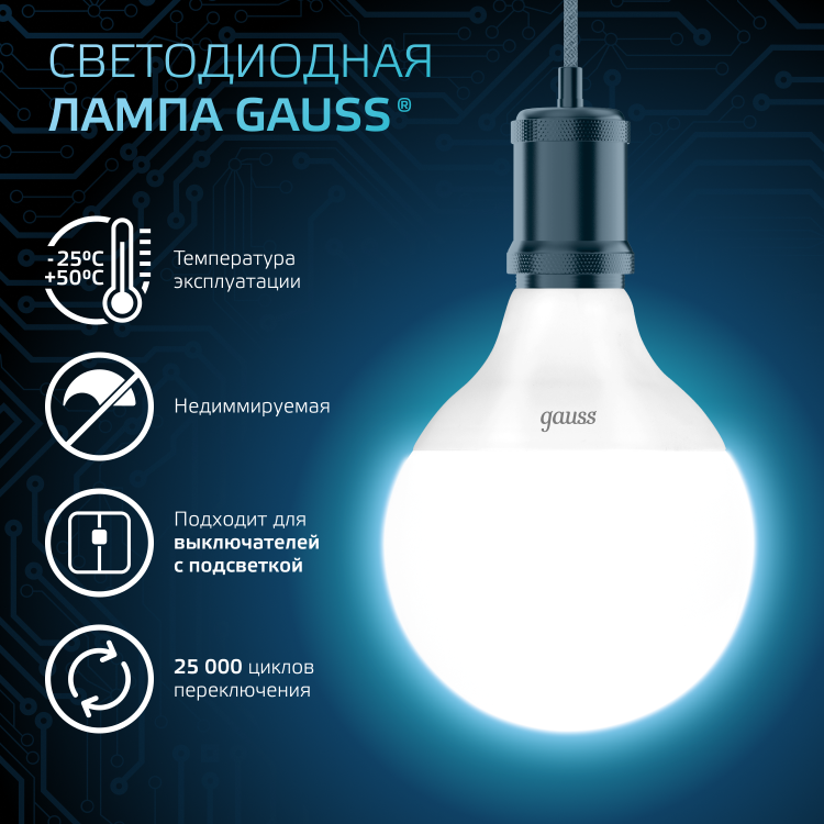 Премиальная серия ламп Gauss Black — надежные источники освещения высокого качества. Благодаря использованию качественных комплектующих и современных технологий лампы этой серии имеют один из самых высоких показателей энергоэффективности и долговечности. Уровень пульсации светового потока в светодиодных лампах Gauss ниже 5%, поэтому они создают комфортный и безопасный свет. Покупатель ламп серии black может быть уверен, что получает безопасный для глаз, яркий и комфортный свет. Передовые технологические решения обеспечивают стабильный световой поток даже при перепадах напряжения. Длительный срок гарантии — решение, основанное на уверенности в качестве продукции и ее долговечности.