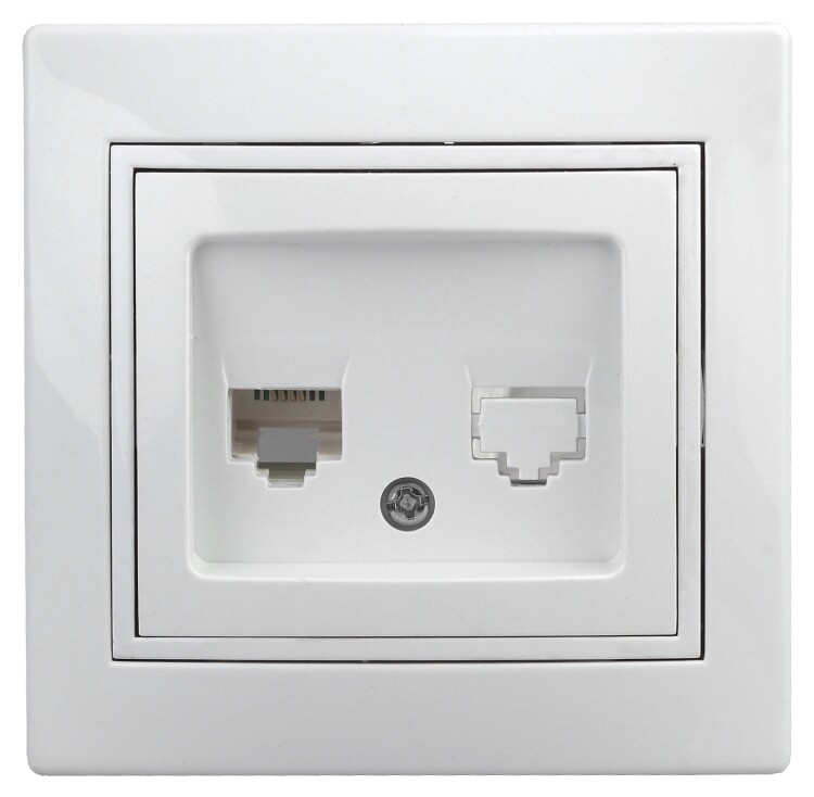Розетка RJ11 серии Intro Plano скрытой установки цвет белый 1-302-01. Номинальные характеристики . Розетка выполнена из те рмопласта, укомплектована одноместной рамкой. Для установки 2-х и более устройств в несколько подрозетников в ряд дополнительно используются многоместные рамки: 2-х постовая - 1-502-хх, 3-х постовая 1-503-хх, 4-х постовая - 1-504-хх (где хх - цветовой код: 01 - белый, 02 - слоновая кость, 03 - алюминий, 04 - шампань, 05 - антрацит, 10 - венге, 11 - сосна).
