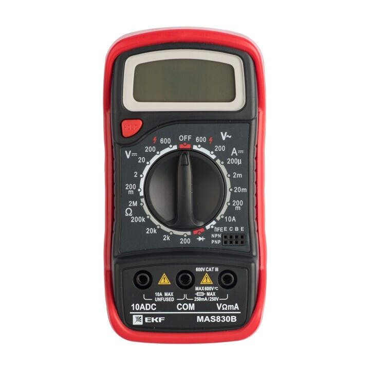 Мультиметр — это универсальный измерительный прибор. В функционал цифрового мультиметра MAS830B EKF Master входит измерение переменного напряжения до 600В, измерение постоянного напряжения до 600В, измерение постоянного тока 10А, измерение электрического сопротивления до 2МОм, проверка диодов и транзисторов.