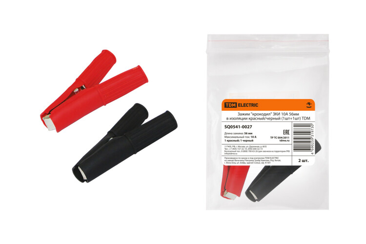 Зажим "крокодил" ЗКИ 10А 56мм в изоляции красный/черный (1шт+1шт) TDM (кр.10упак)