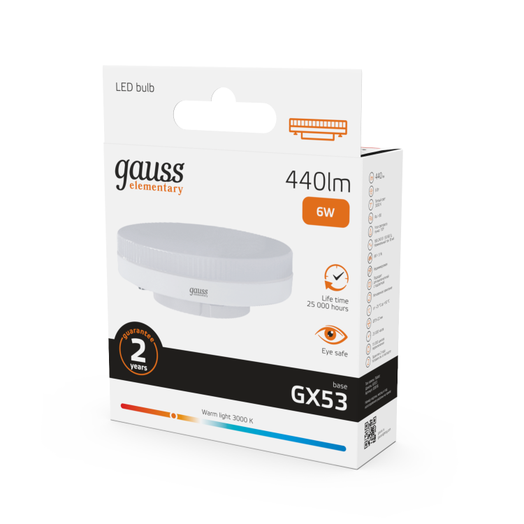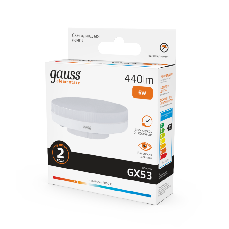 Лампа Gauss Elementary GX53 это решение для использования в натяжных и подвесных потолках домашних и коммерческих помещений. Обеспечивает относительно яркий и равномерный свет, без пульсаций, с температурой 3000К, дающий комфортное ощущение начала хорошего дня.