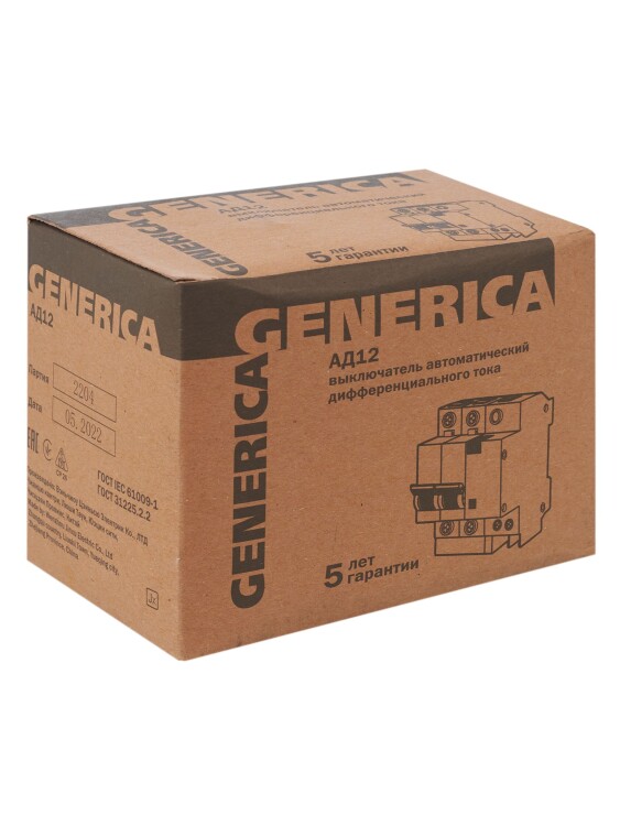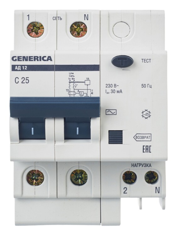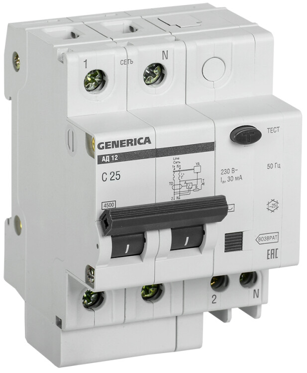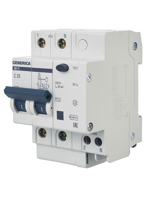Диф. автомат АД12 2Р 25А 30мА GENERICA (кр.1шт)