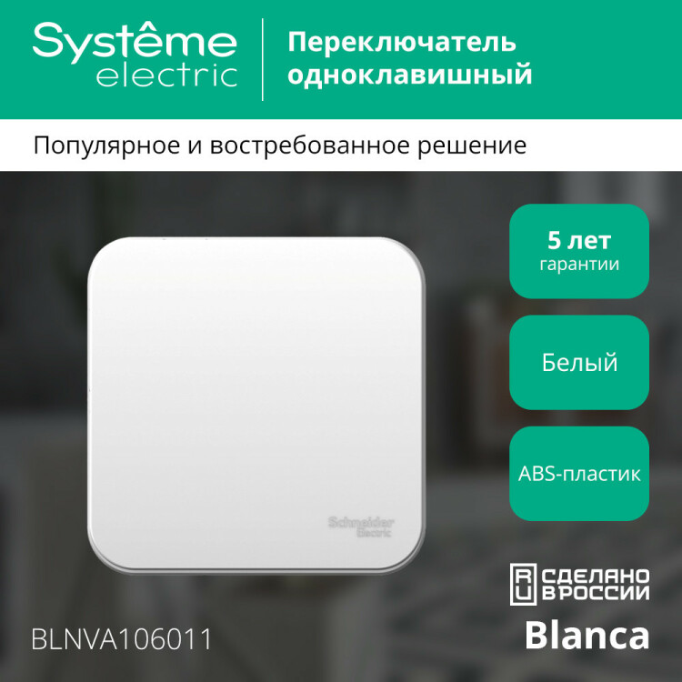 Переключатель Systeme Electric (ранее Schneider Electric) BLANCA (белый, открытой установки) с изолирующей пластиной одноклавишный предназначен для сетей до 250В, на ток до 10А. Переключатель позволяет управлять одним источником света из двух точек. Его можно установить, например, в двух концах коридора, у входа в комнату или у кровати. Корпус изделия выполнен из ABS-пластика.
