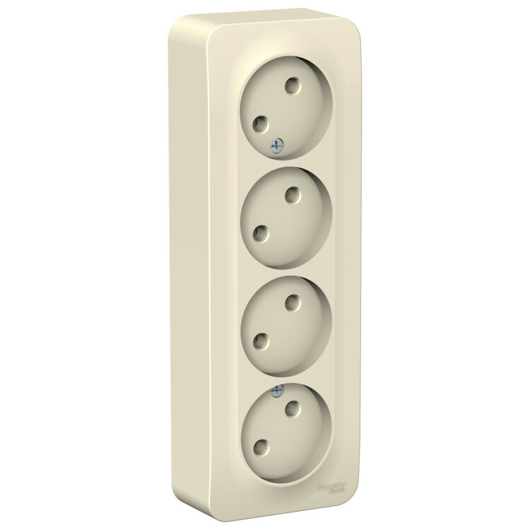 Розетка Systeme Electric (ранее Schneider Electric) BLANCA (молочный, открытой установки) четырехместная, без шторок и заземления, с изолирующей пластиной предназначена для сетей до 250В, на ток до 16А. четырехместная розетка позволяет подключить четыре устройства в одном месте. Она изготовлена из ABS-пластика, проста в установке и удобна в применении.
