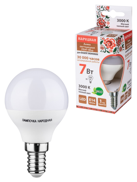 Лампа светодиодная FG45-7 Вт-230 В-3000 К–E14 Народная (кр.10шт)