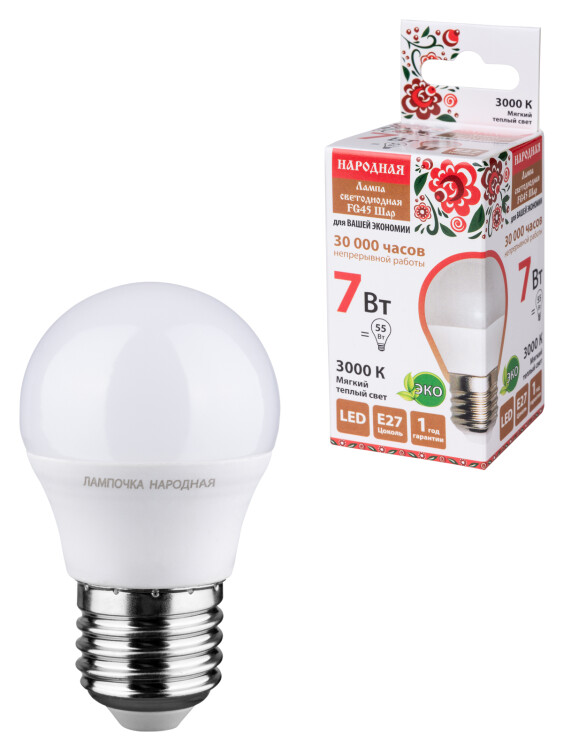 Лампа светодиодная FG45-7 Вт-230 В-3000 К–E27 Народная (кр.10шт)