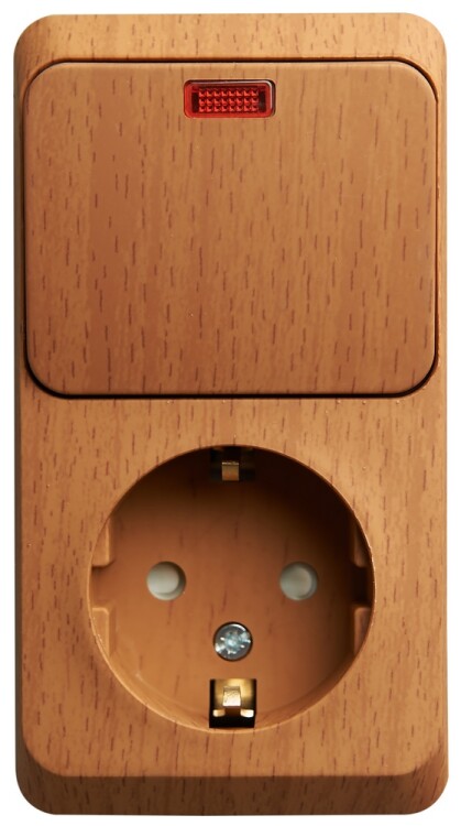 Блок Schneider Electric ЭТЮД (бук, открытой установки) предназначен для применения в сетях до 250В, состоит из розетки на 16А с заземлением и шторками и одноклавишного выключателя на 10А с подсветкой, что делает его легко находимым при отсутствии освещения. Он удобен в применении и отлично подходит для коридора. Изделия цвета Бук обладают уникальным рисунком, напоминающим древесный сруб. Сделано в России.