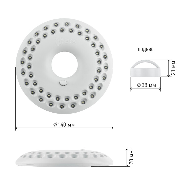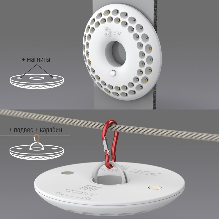 Светодиодный кемпинговый фонарь в футуристичном дизайне, специально разработанном компанией ЭРА. Фонарь предназначен для активного отдыха, отдыха на природе, для пикников, дачи. Дизайн фонаря функционален. 48 мощных светодиодов расположены по кругу таким образом, чтобы освещать максимально большую площадь ярким белым. Светодиоды энергоэкономичны, не перегорают и не требуют замены. Посередине фонаря предусмотрено отверстие, если надеть фонарь на любую подставку, например, на бутылку, получится настольный светильник. Фонарь оснащён мощным магнитом, так что его легко приклеить к металлической поверхности. Корпус выполнен из ударопрочного пластика и защищает от царапин и механических повреждений, а светодиоды встроены внутрь корпуса, что обеспечивает им дополнительную защиту. Дальность луча фонаря составляет 21 метр, мощность - 3,3Вт. Фонарь питается от двух батареек АА. Это позволило сделать фонарь портативным и лёгким, но в тоже время надёжным. Фонарь комплектуется кронштейном для подвешивания. Фонарь можно использовать не только в походах, но и в любых ситуациях, когда необходим яркий дополнительный источник света.
